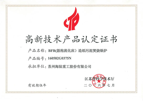 近日,公司收到江蘇省科學(xué)技術(shù)廳頒發(fā)的高新技術(shù)產(chǎn)品認(rèn)定證書, 我公司的研制BFB(鼓泡流化床)造紙污泥焚燒鍋爐獲省高新技術(shù)產(chǎn)品認(rèn)定。該產(chǎn)品主要用于造紙廠處理污泥工藝流程中,將造紙污泥干化后摻煤燃燒,解決污泥廢物處置問題,同時(shí)對(duì)污泥焚燒過程產(chǎn)生的熱量進(jìn)行回收,產(chǎn)生次高壓蒸汽用于發(fā)電或造紙工藝循環(huán)利用,實(shí)現(xiàn)了環(huán)境污染治理與資源循環(huán)利用并舉。