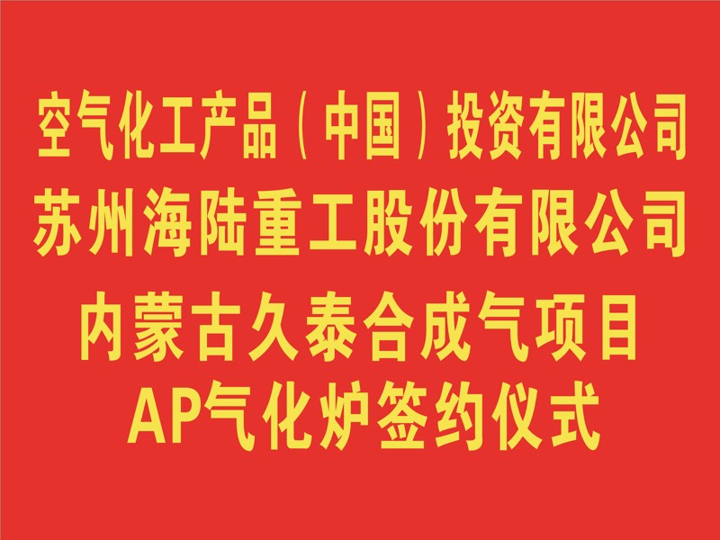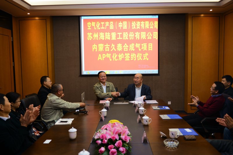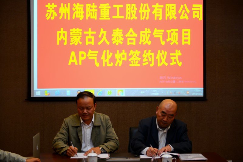 2018年12月6日下午,在海陸重工會議室,空氣化工產(chǎn)品(中國)投資有限公司與蘇州海陸重工股份有限公司,舉行久泰合成氣項目AP氣化爐簽約儀式,AP公司采購總監(jiān)戴曉輝與海陸重工鍋爐事業(yè)部總經(jīng)理陳吉強分別在簽約書上簽字