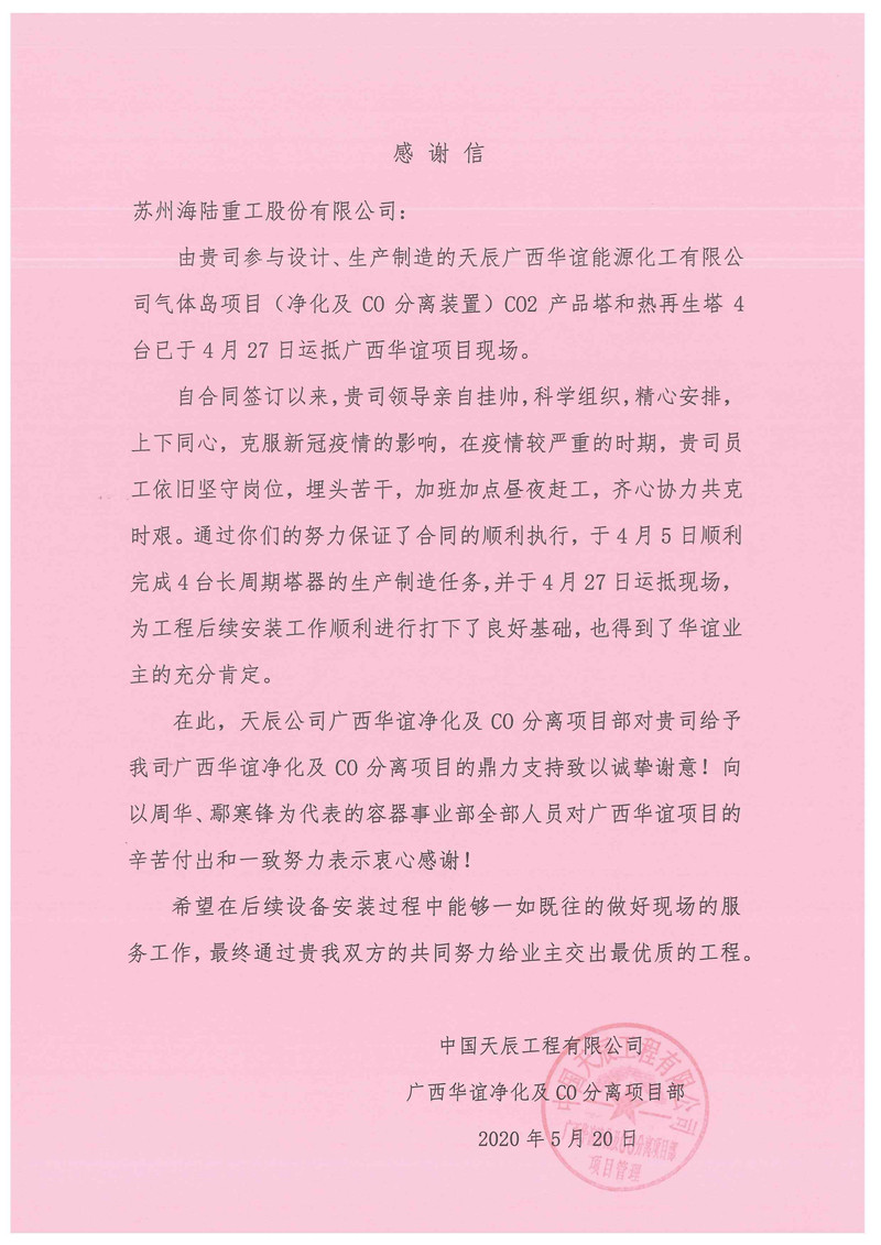 編后語:收到客戶的感謝信,我們的心中十分的激動,但小編還是要向每一位尊貴的客戶說一句:“這是我們應(yīng)該做的,謝謝你們這么多年對我們海陸的關(guān)心和支持,我們海陸一定會做的更好?!?br /> 海陸重工作為國內(nèi)一流的節(jié)能環(huán)保設(shè)備專業(yè)設(shè)計制造企業(yè),產(chǎn)品覆蓋鍋爐、壓力容器、核電、冶金及環(huán)保工程等多個產(chǎn)品領(lǐng)域,秉承“科技領(lǐng)航 業(yè)界先鋒”的理念,順應(yīng)時代發(fā)展,致力于為實現(xiàn)國家節(jié)能環(huán)保的戰(zhàn)略目標(biāo)做出更大貢獻。
